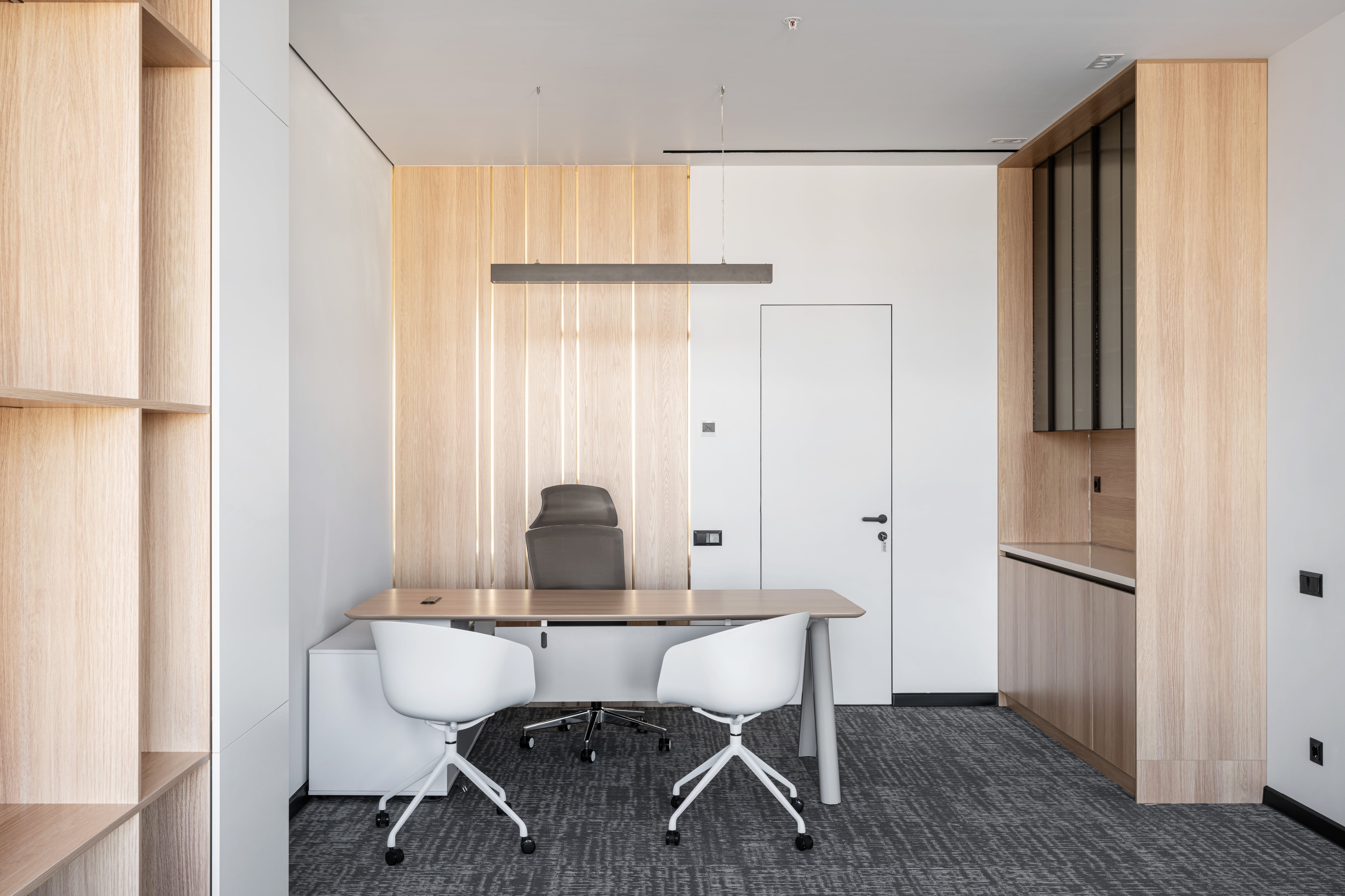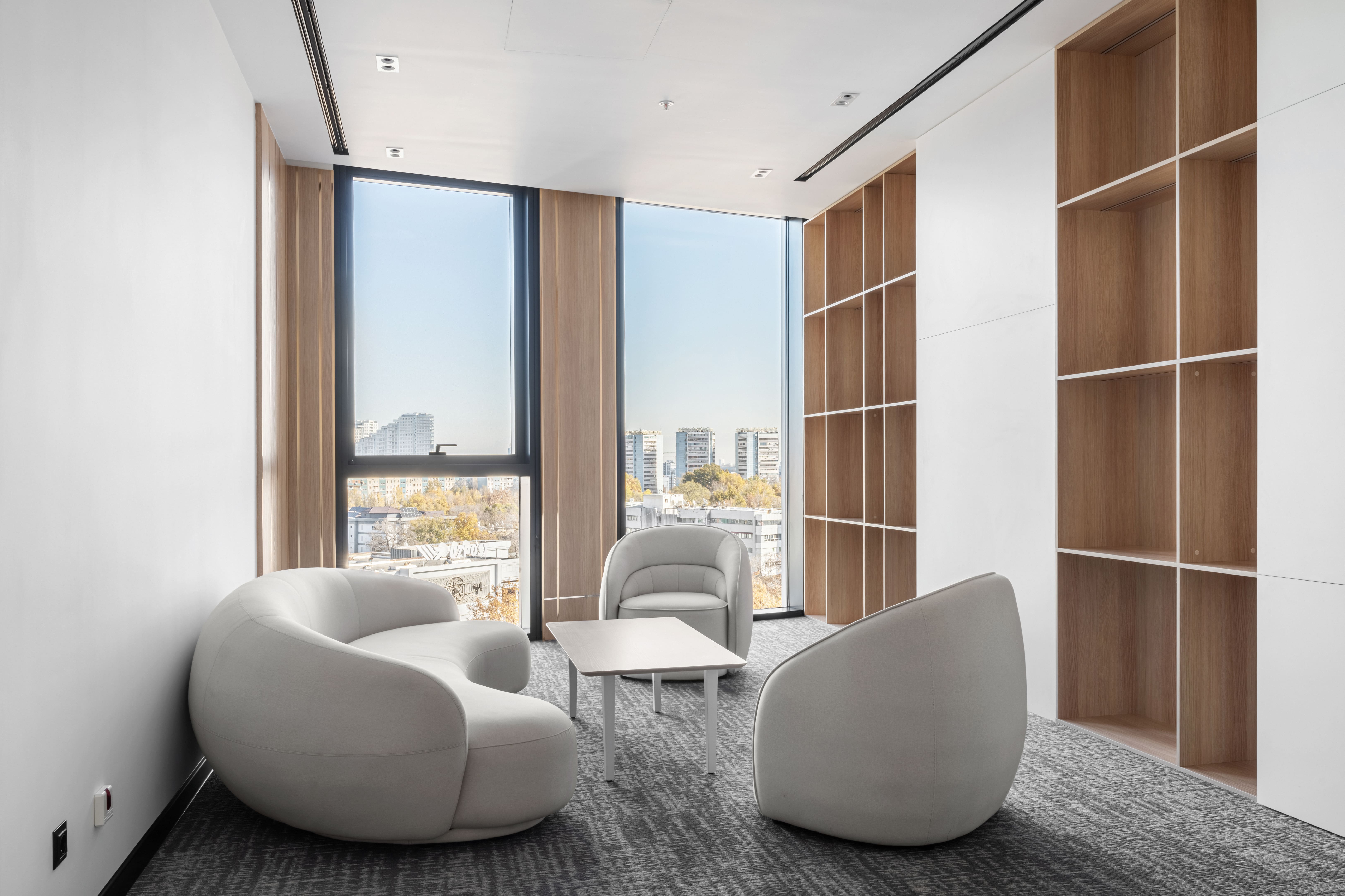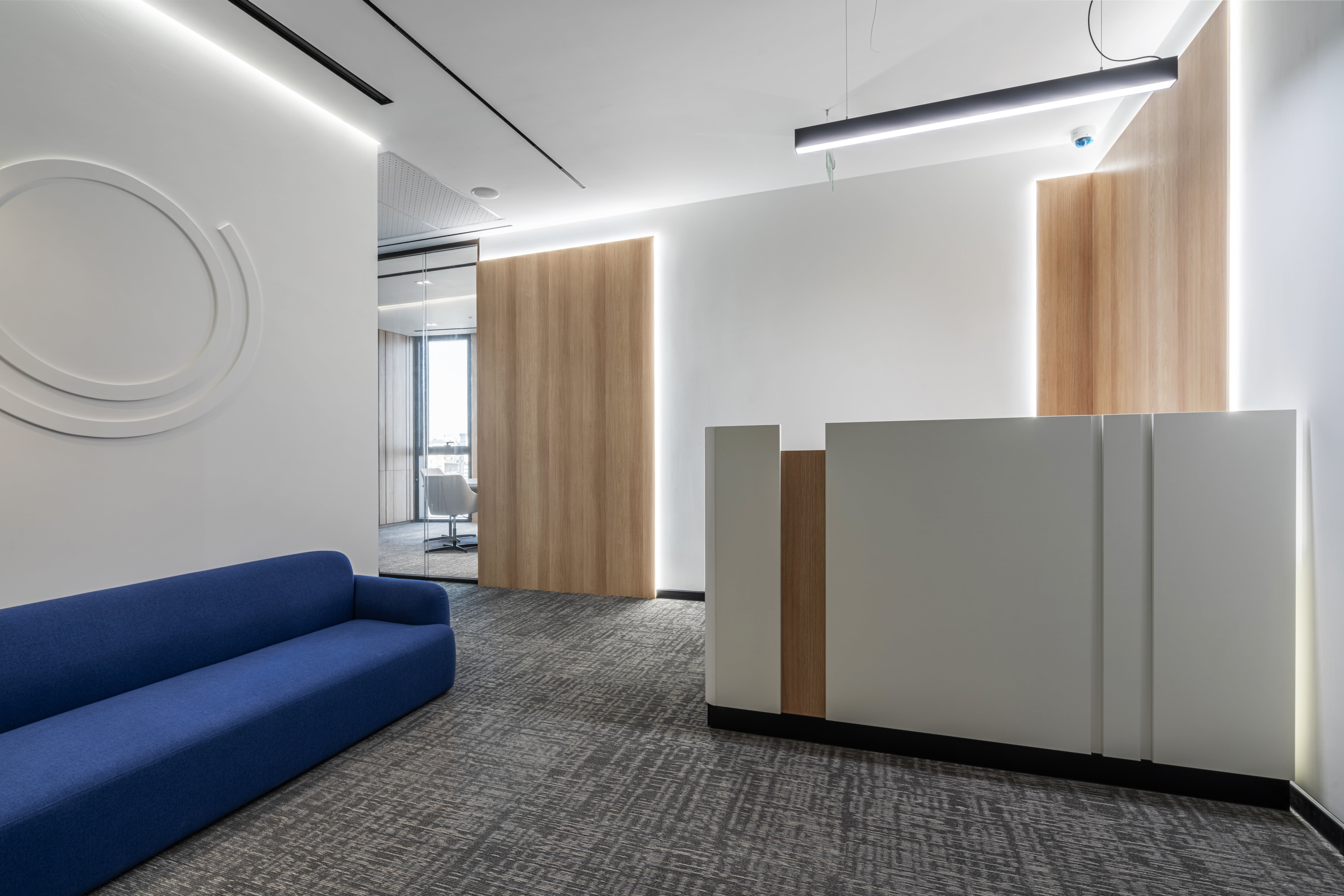 Отделочные материалы подбирались с учётом интенсивной эксплуатации. В основных рабочих зонах установлена ковровая плитка Shaw Contract — признанного лидера в сегменте коммерственных напольных покрытий, отличающаяся высокой износостойкостью и стабильностью размеров.В помещениях с повышенной проходимостью и частыми циклами уборки использована LVT-плитка Shaw Contract, обеспечивающая долговечность и равномерность покрытия.