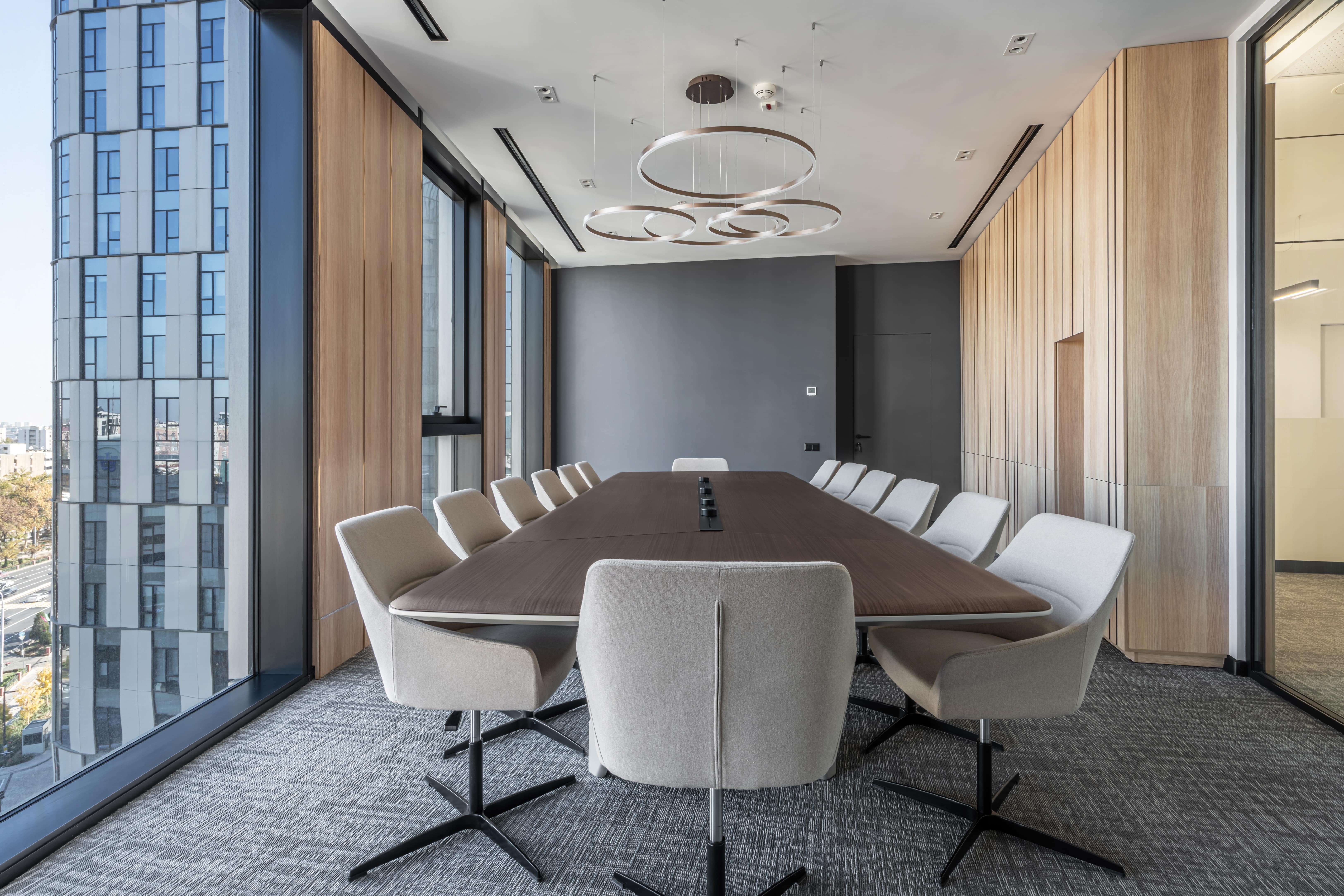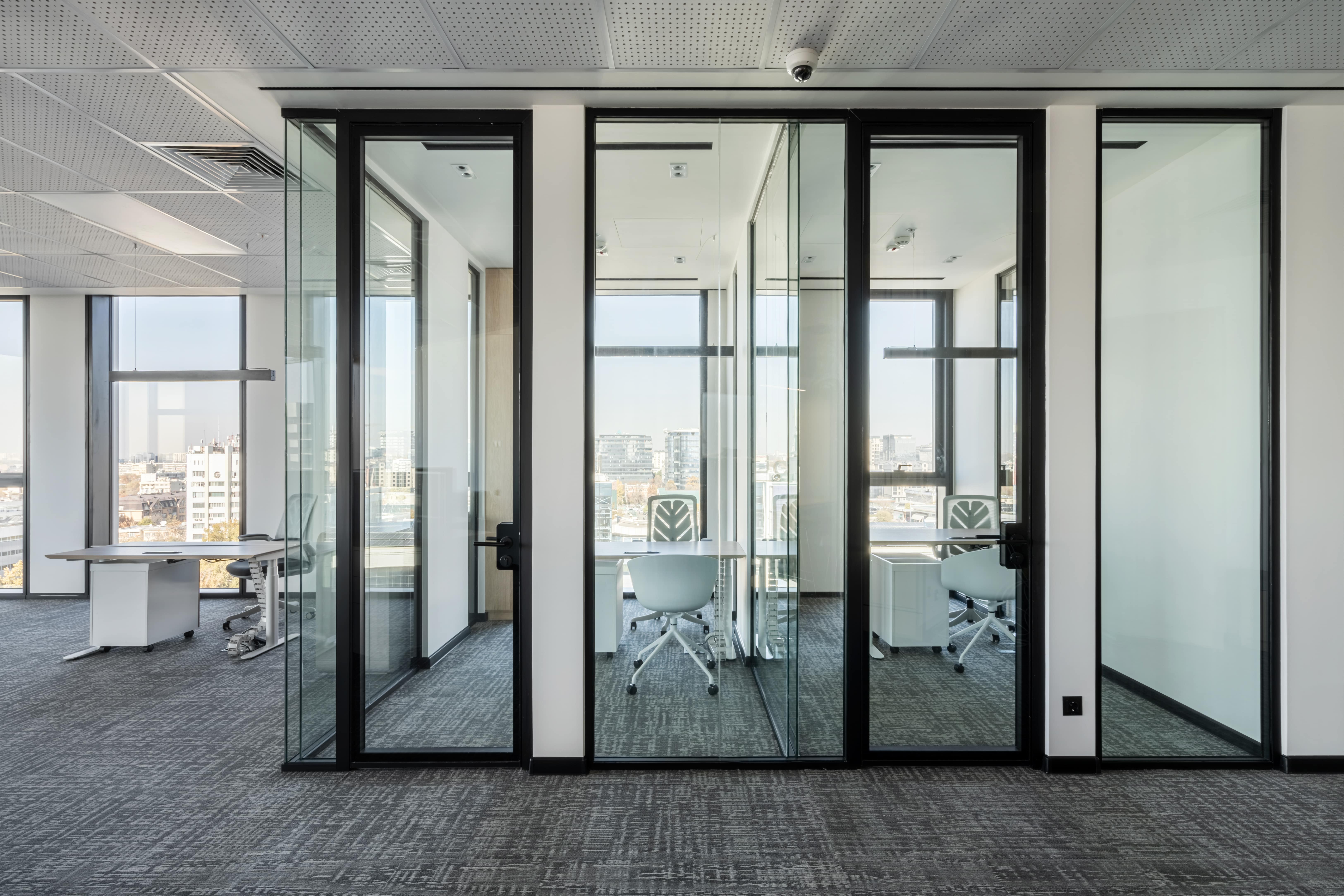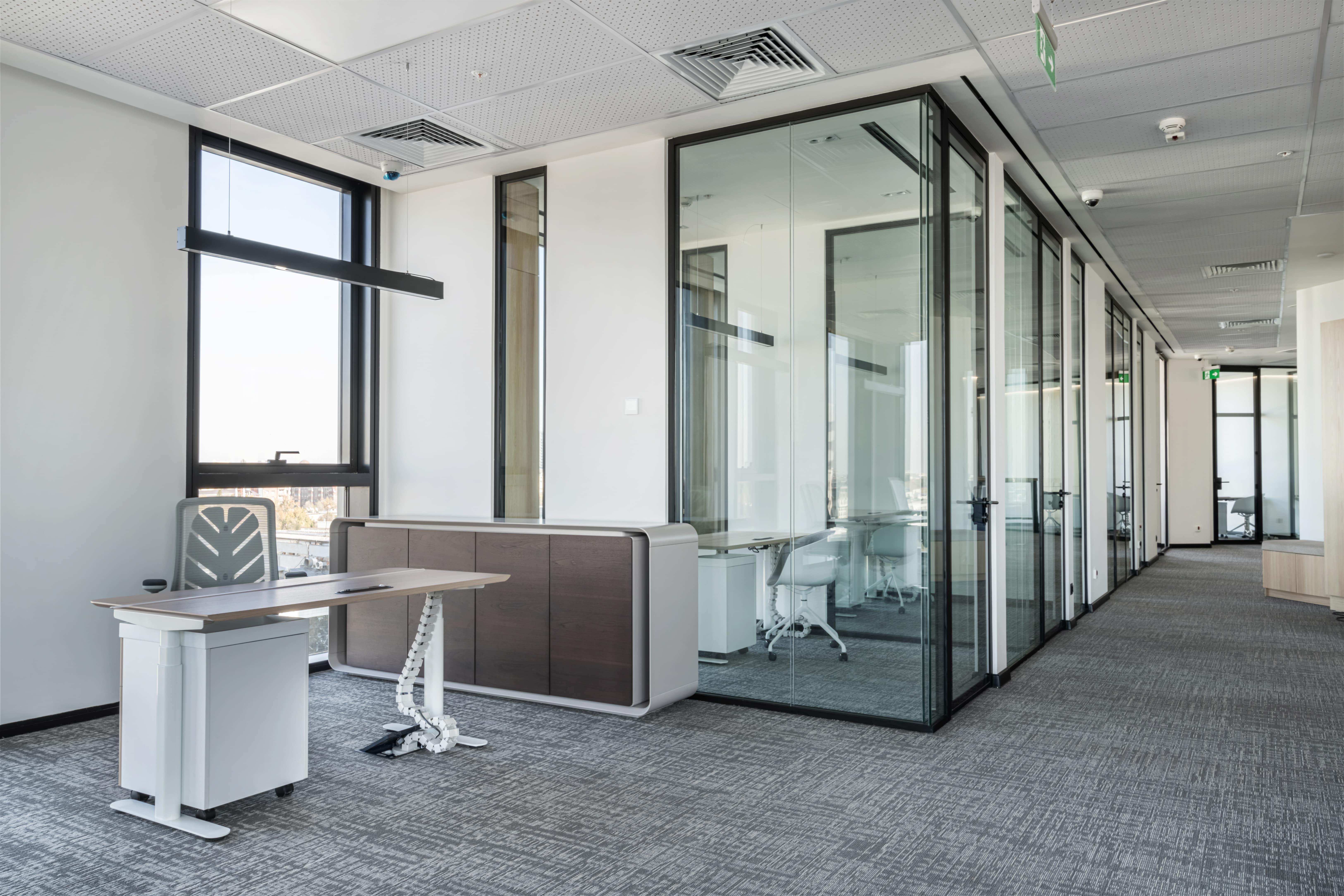 Отделочные материалы подбирались с учётом интенсивной эксплуатации. В основных рабочих зонах установлена ковровая плитка Shaw Contract — признанного лидера в сегменте коммерственных напольных покрытий, отличающаяся высокой износостойкостью и стабильностью размеров.В помещениях с повышенной проходимостью и частыми циклами уборки использована LVT-плитка Shaw Contract, обеспечивающая долговечность и равномерность покрытия.